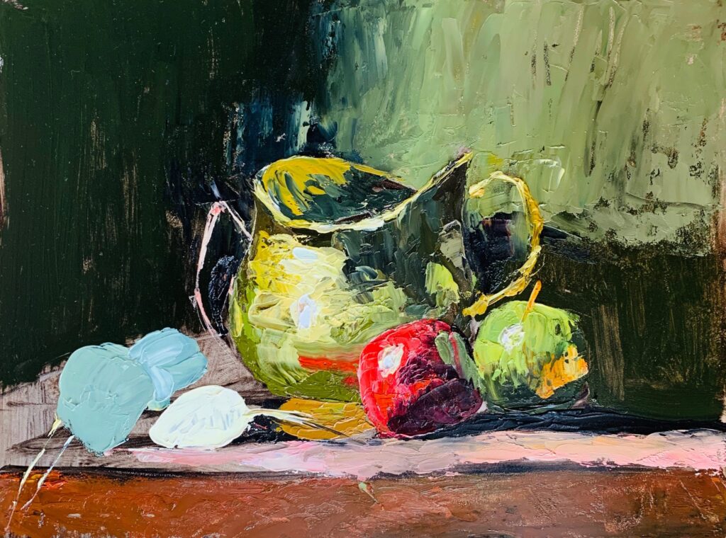 We at the TCJ agree. Shraddha’s paintings beckon you to reach into them and touch the objects. Her still life pots, cups & bowels seem to call out for you to pick them up. You feel as though the fruit and vegetables are ripe, ready to be eaten and you want desperately to reach in and grab one. To convey this type of wanting in oil, especially through impressionism, is no easy task. Yet Shraddha has mastered it beautifully.