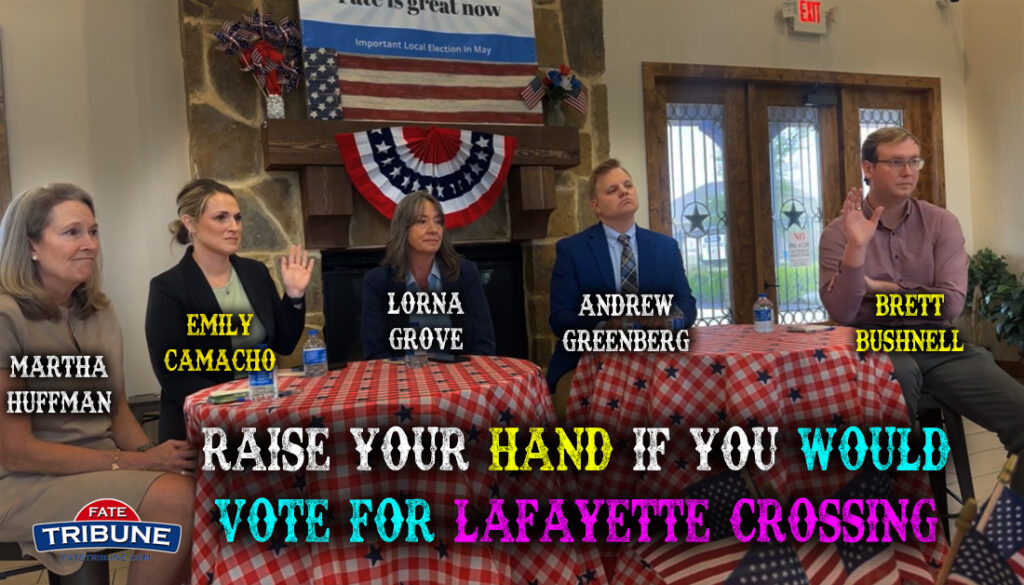 Fate, TX – In a moment that crystallized one of the defining issues of the upcoming May election in Fate, Texas, candidates for City Council faced a blunt but revealing question at a recent public forum: “Would you have voted in favor of LaFayette Crossing?”