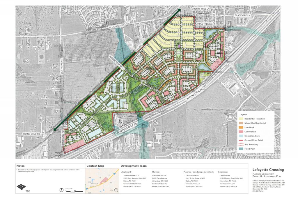 A site plan submitted by the developer, D-F Funds GP, LLC, led by Robert Yu, shows the project title “Lafayette Crossing” clearly identified in the title block on December 20, 2023. The document was part of the city’s official development review for the controversial project at the corner of I-30 and Highway 551.