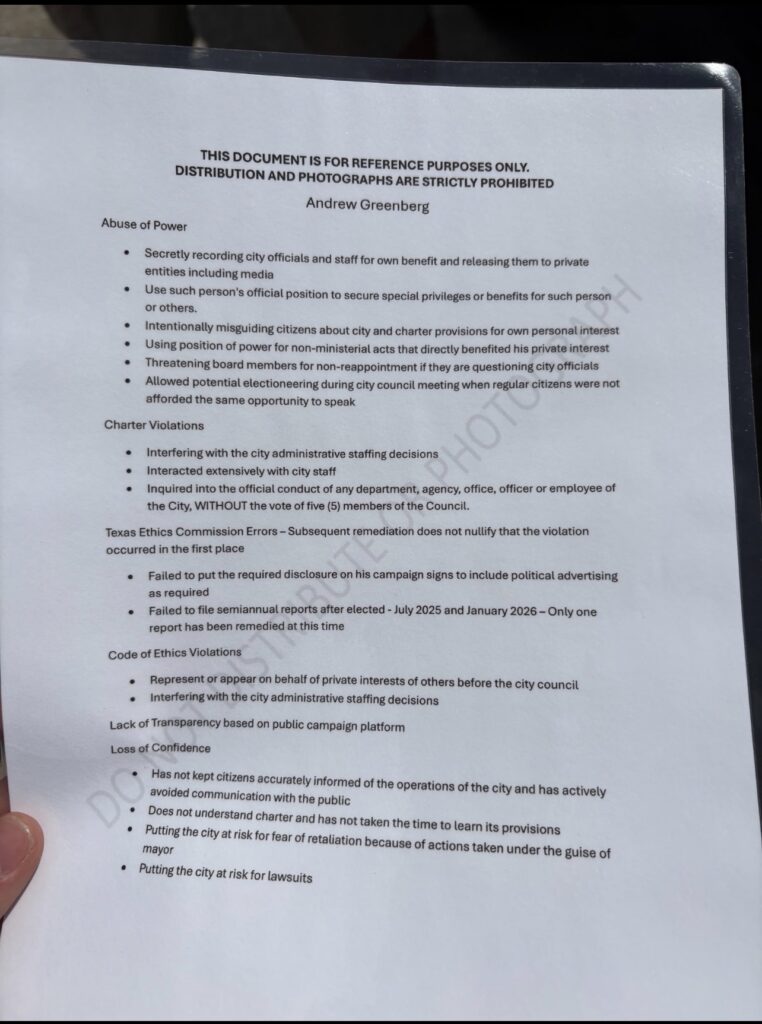 FATE, TX – A document containing unproven allegations, some of which could raise defamation concerns if false, and stamped with a warning against distribution, is now at the center of a growing political storm in Fate, Texas, after a student’s testimony revealed it was nonetheless handed out at a public recall event targeting the mayor.