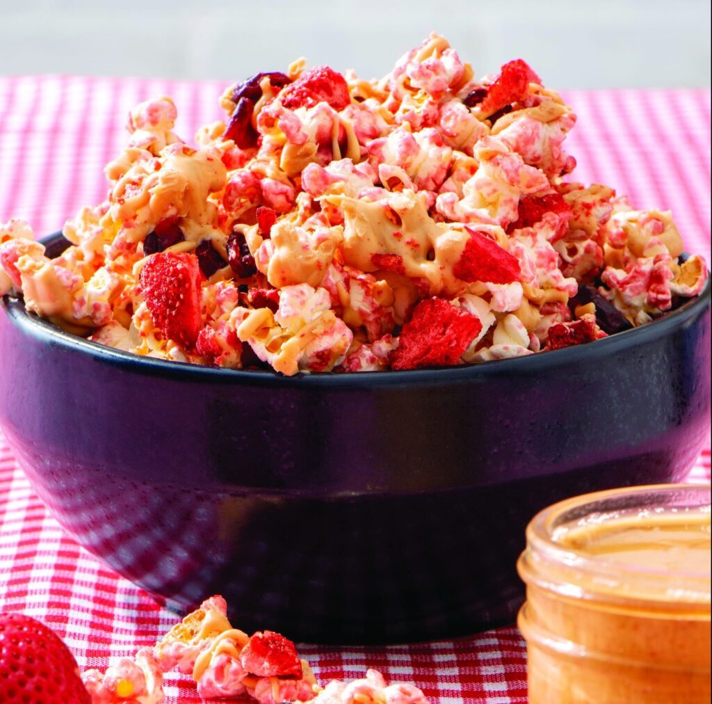 - Take yourself back in time to your own childhood with a classic pairing that never goes out of style: Peanut Butter and Jelly Popcorn. This version offers a fun way to jazz up popcorn for kids and adults alike with a sprinkling of strawberries and dried cranberries on top for added nutrition.