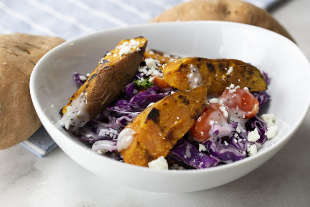 Nutritious and full of antioxidants, sweetpotatoes are a perfect option for summer recipes as they’re easy to grill in a recipe like Sweetpotato Wedge & Purple Cabbage Salad with Poppyseed Dressing. Hearty yet light for a tasty side dish, this salad is effortlessly simple and combines crispy purple cabbage, juicy tomato, velvety feta and poppyseed dressing around sweetpotato wedges as the star of the show.